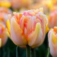 Тюльпан Фокси Фокстрот, вырастающий до полуметра в высоту и радующий садоводов обильным цветением с конца апреля до середины мая, пожалуй, можно назвать самым аппетитным растением. Его огромные бутоны, достигающие 12-15 см в диаметре, имеют окрас сочного, спелого и ароматного персика. Крупные махровые лепестки нежного желто-оранжевого цвета ненавязчиво украшены тонкими прожилками красноватого оттенка.